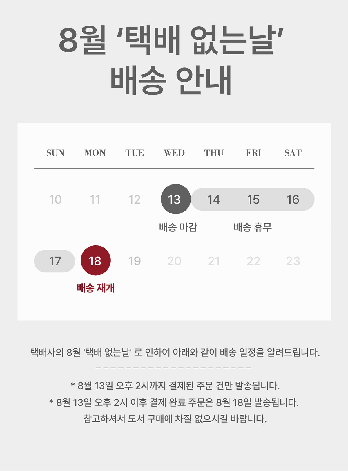 택배 없는 날 배송 마감안내( 8월 13일 수요일 오후 2시 택배마감 - 8월 18일 월요일 발송)